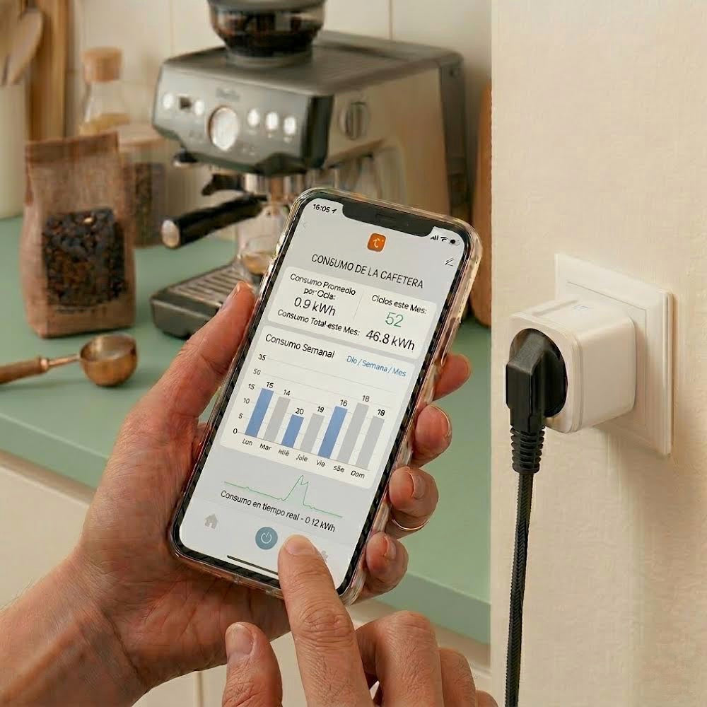 Incluye monitorización del consumo eléctrico en tiempo real y opción de programación de horarios para automatizar rutinas diarias.